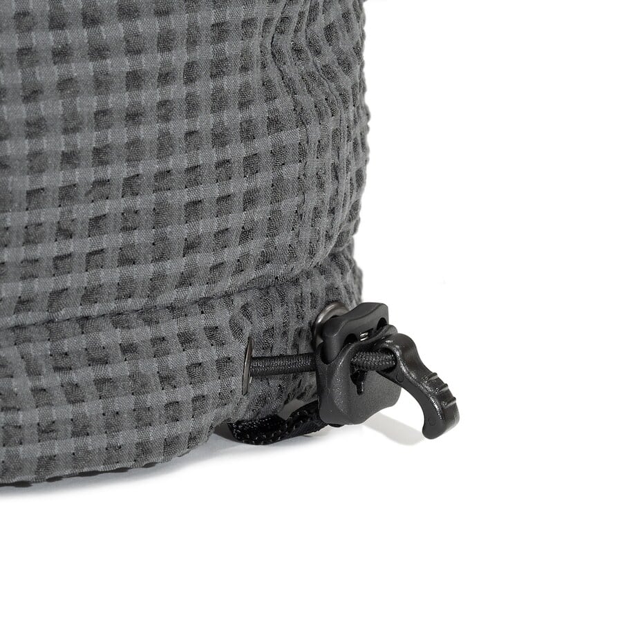 後部にあるプラスチックタブを引っ張ることでゴムを引き締め、簡単にサイズを調整できます。この調整機能により、着用時のフィット感が向上し、風が強い環境でも安定した装着感を実現します。特に山頂や稜線など、強風が予想されるアウトドアシーンでその効果を発揮します。