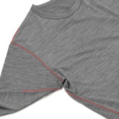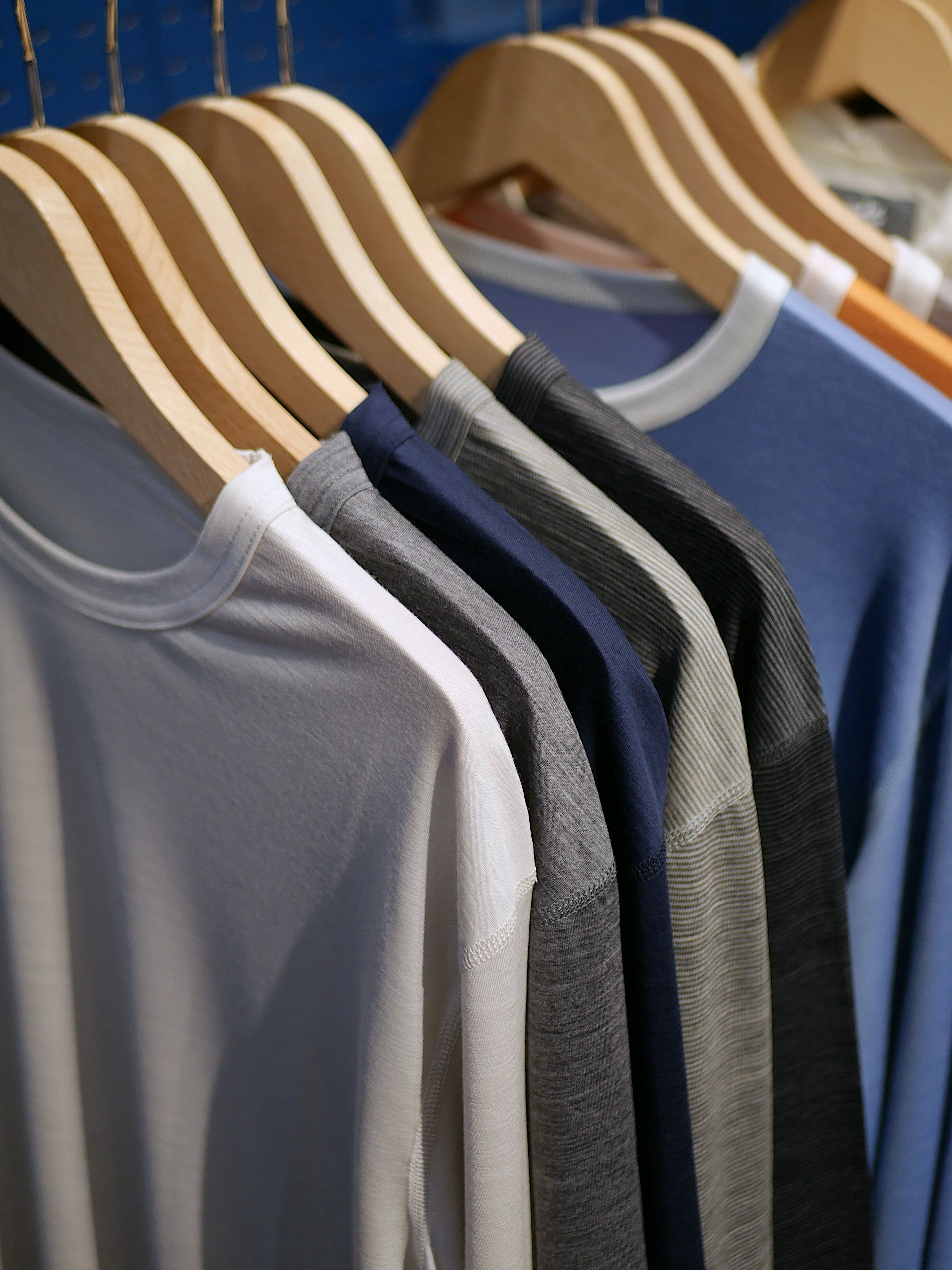 今回Merino Basic Teeには「Super 120’s」と表記される17.5μm(マイクロメートル)の非常に繊細な糸を使用し、ウール特有の「チクチク感」が極めて少ないソフトな風合いに仕上がっています。