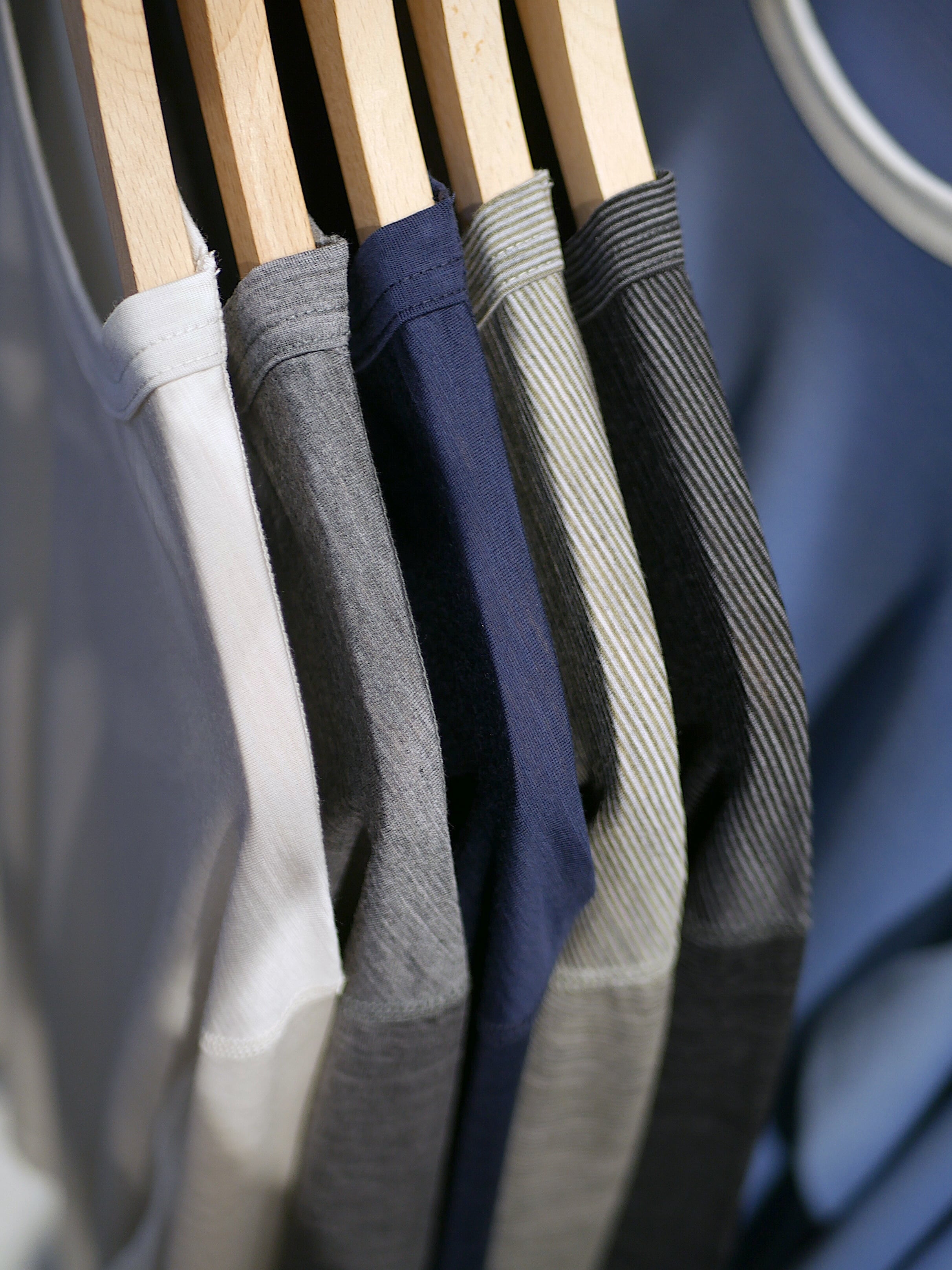 今回Merino Basic Teeには「Super 120’s」と表記される17.5μm(マイクロメートル)の非常に繊細な糸を使用し、ウール特有の「チクチク感」が極めて少ないソフトな風合いに仕上がっています。