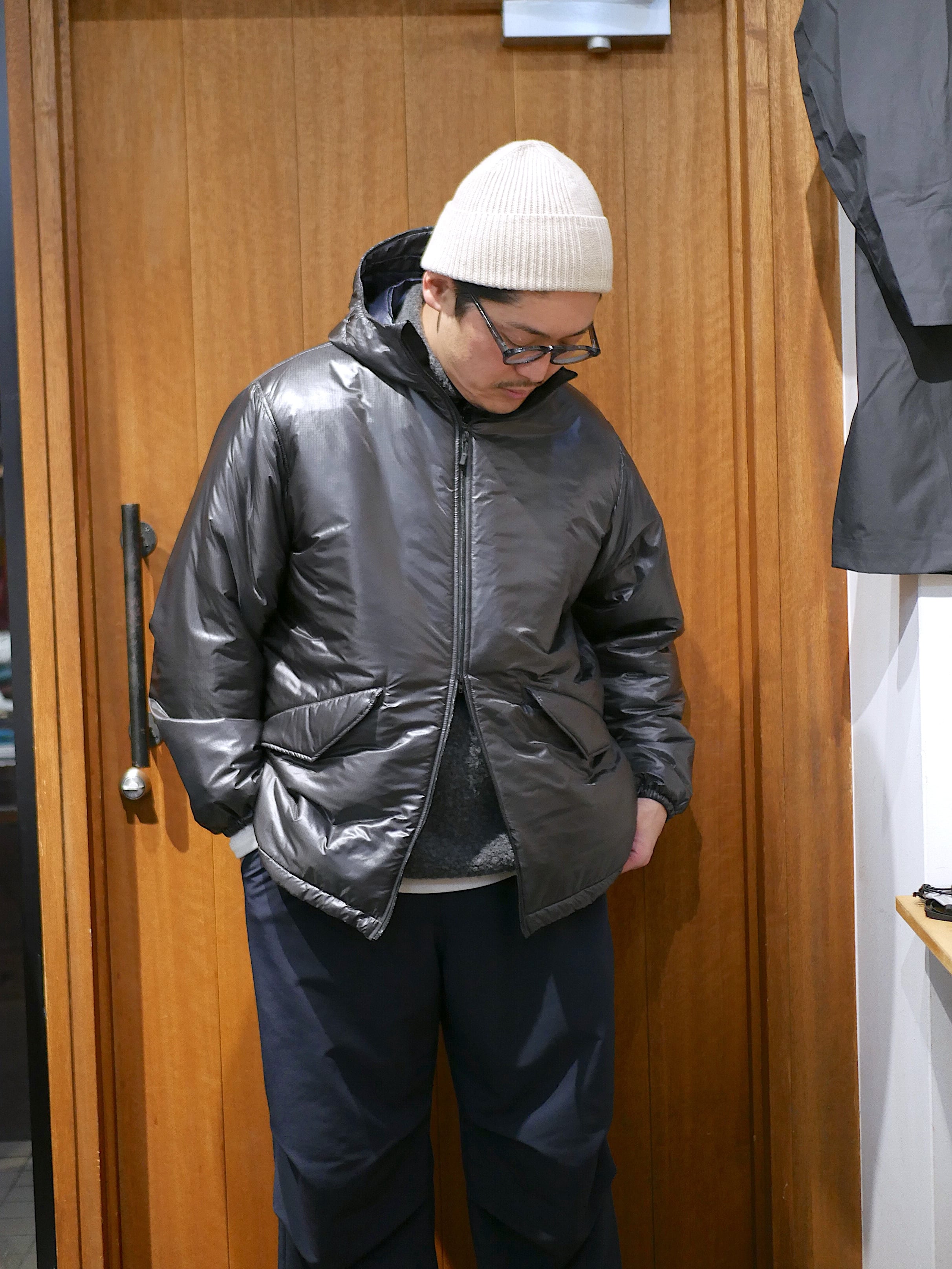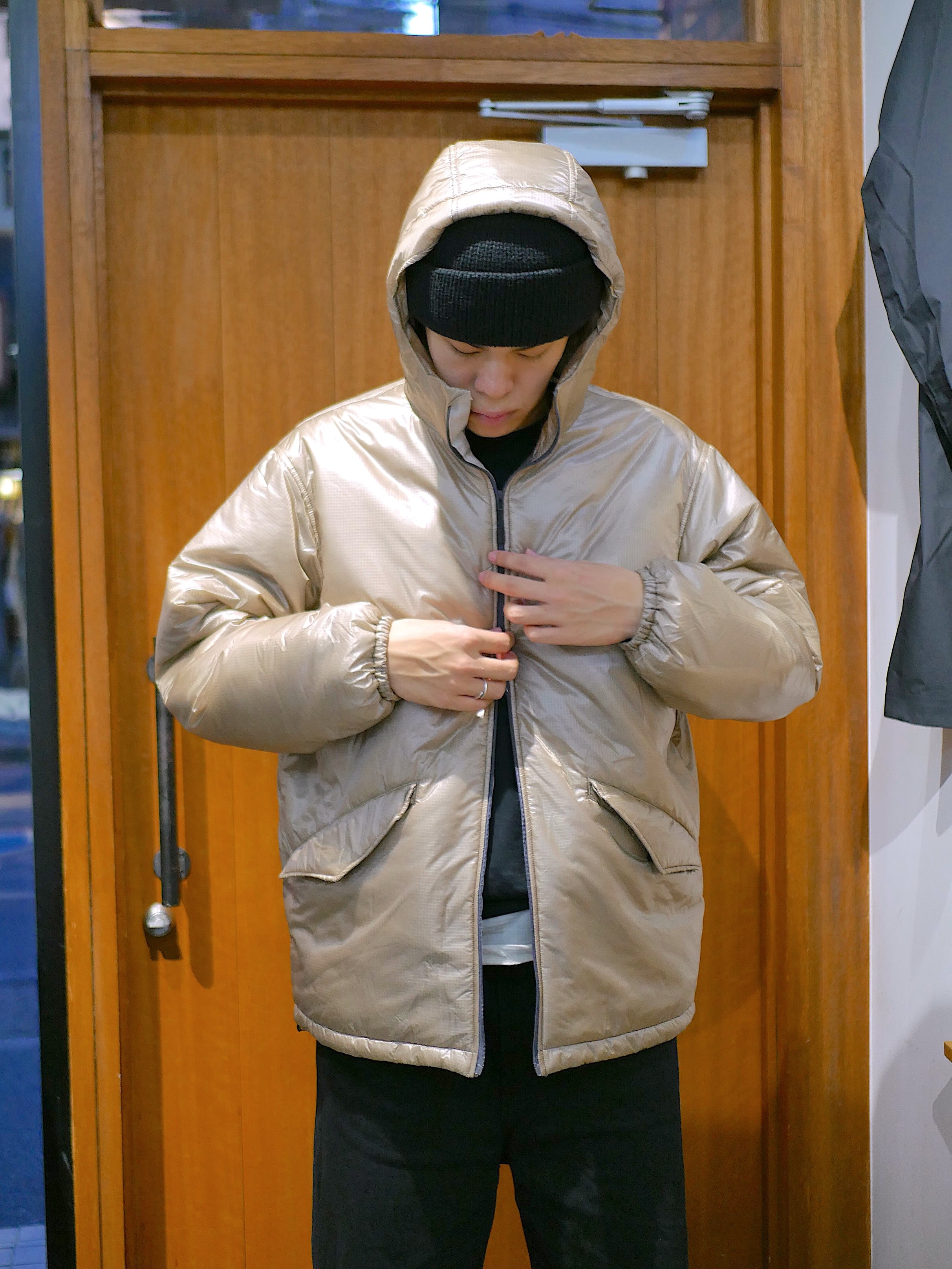 定番の"Coach"のサイジングをベースにした、ゆとりのあるボックスシルエット。フードにも中綿使用のため、ツバ芯はなし。