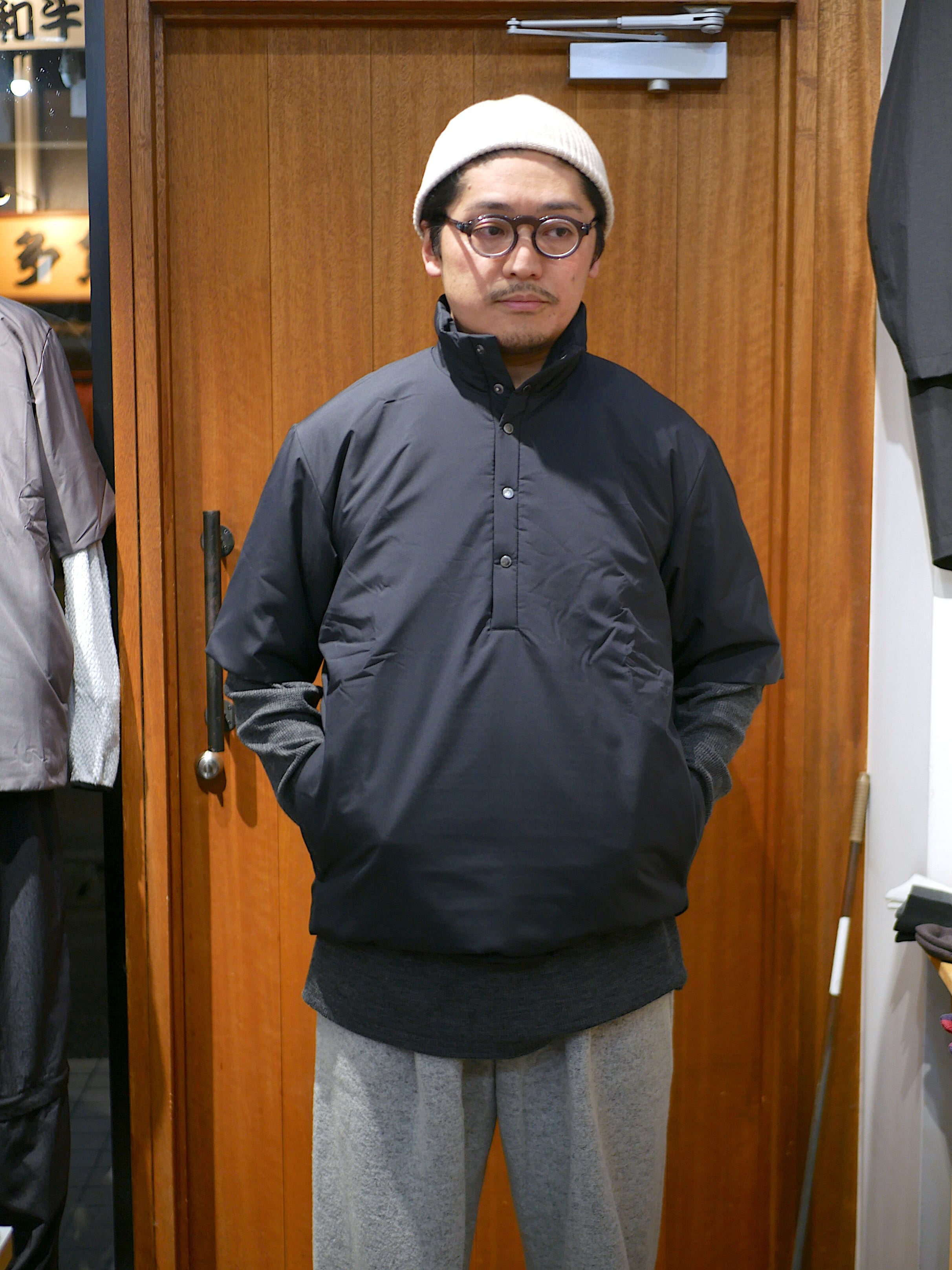 首元にスナップボタンをあしらったTシャツタイプのインサレーション・ジャケット。