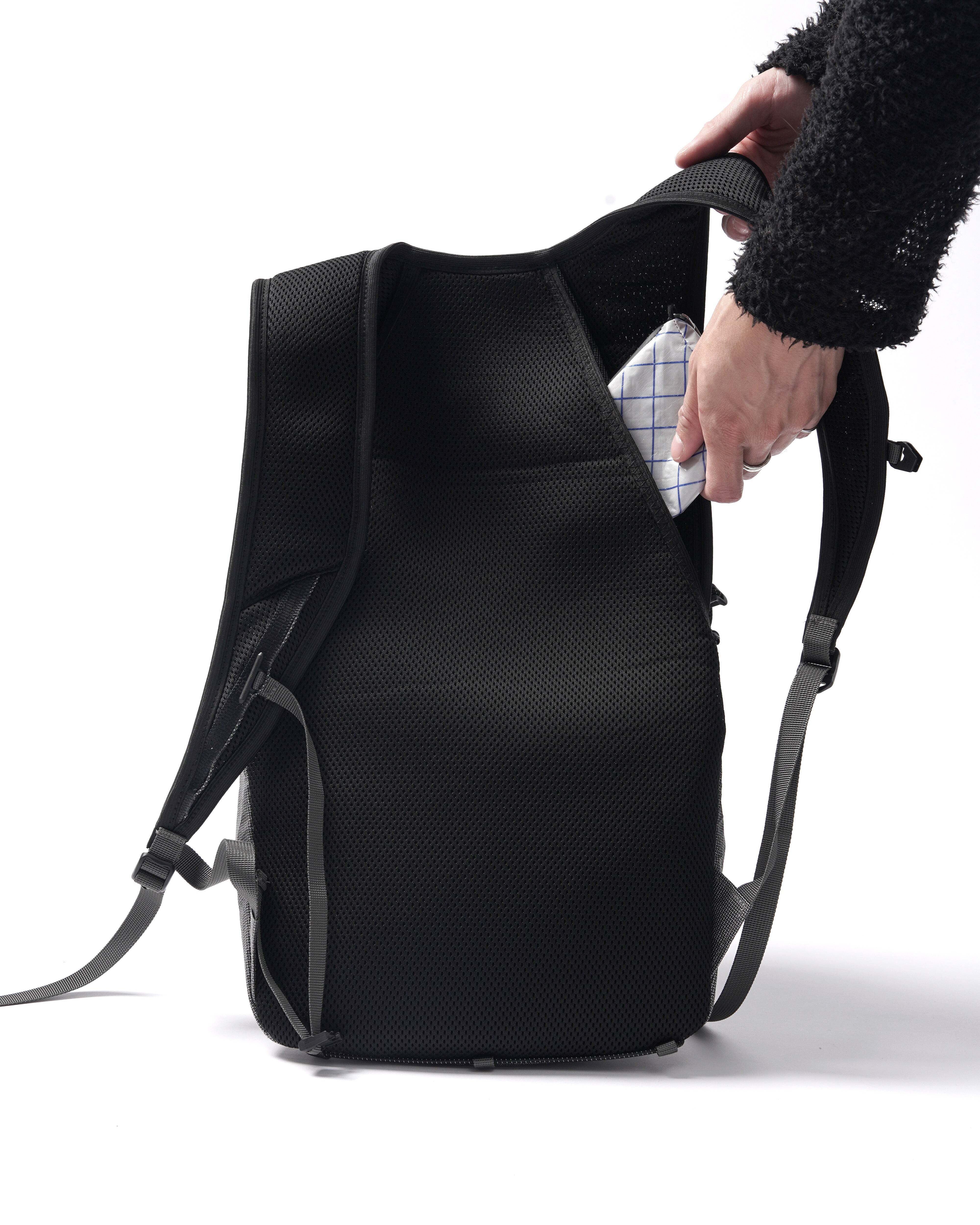 14Lのメインコンパートメントには、12.9インチiPad Proを収納できるメッシュスリーブを内蔵。背面パネルにもメッシュスリーブが備わっており、スマートフォン・財布などはもちろん、ハイキング用グランドシートなどの収納ができ、素早くアクセスができます。