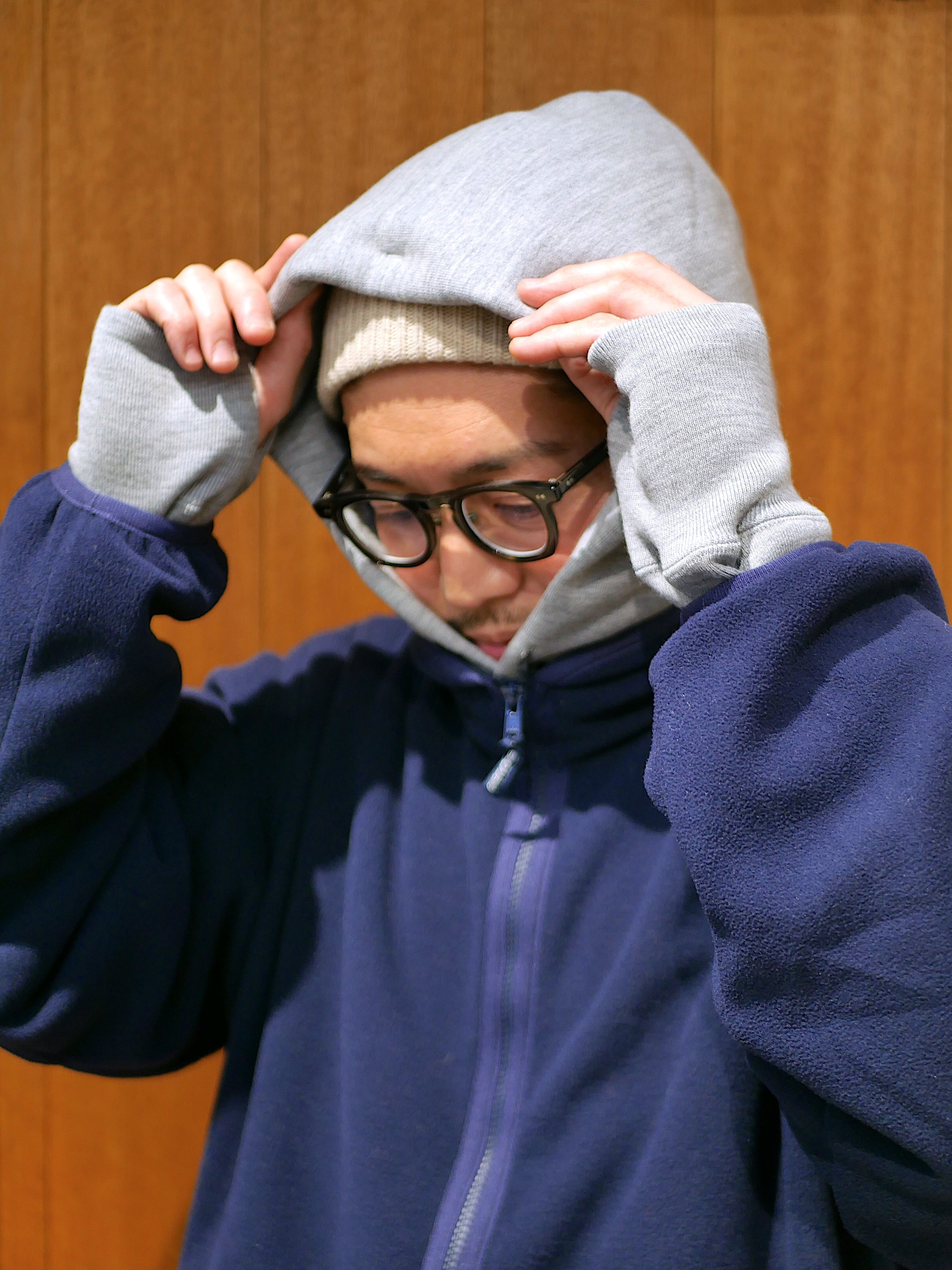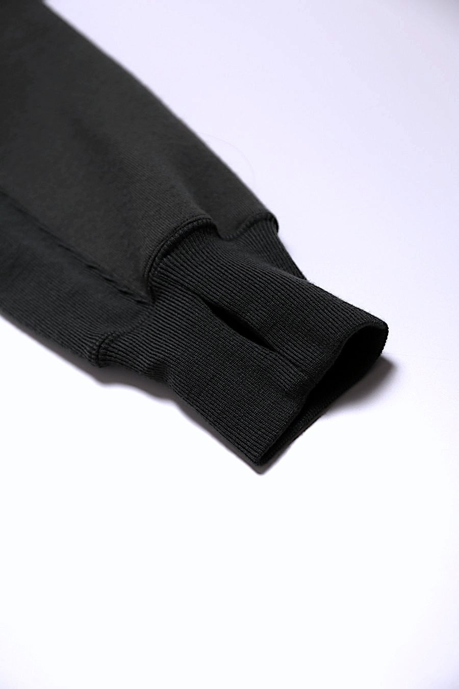 基本型であるCREW SWEATを軸とし、保温性を高めるべくサムホールの付きの袖リブとフード・カンガルーポケットを追加しました。