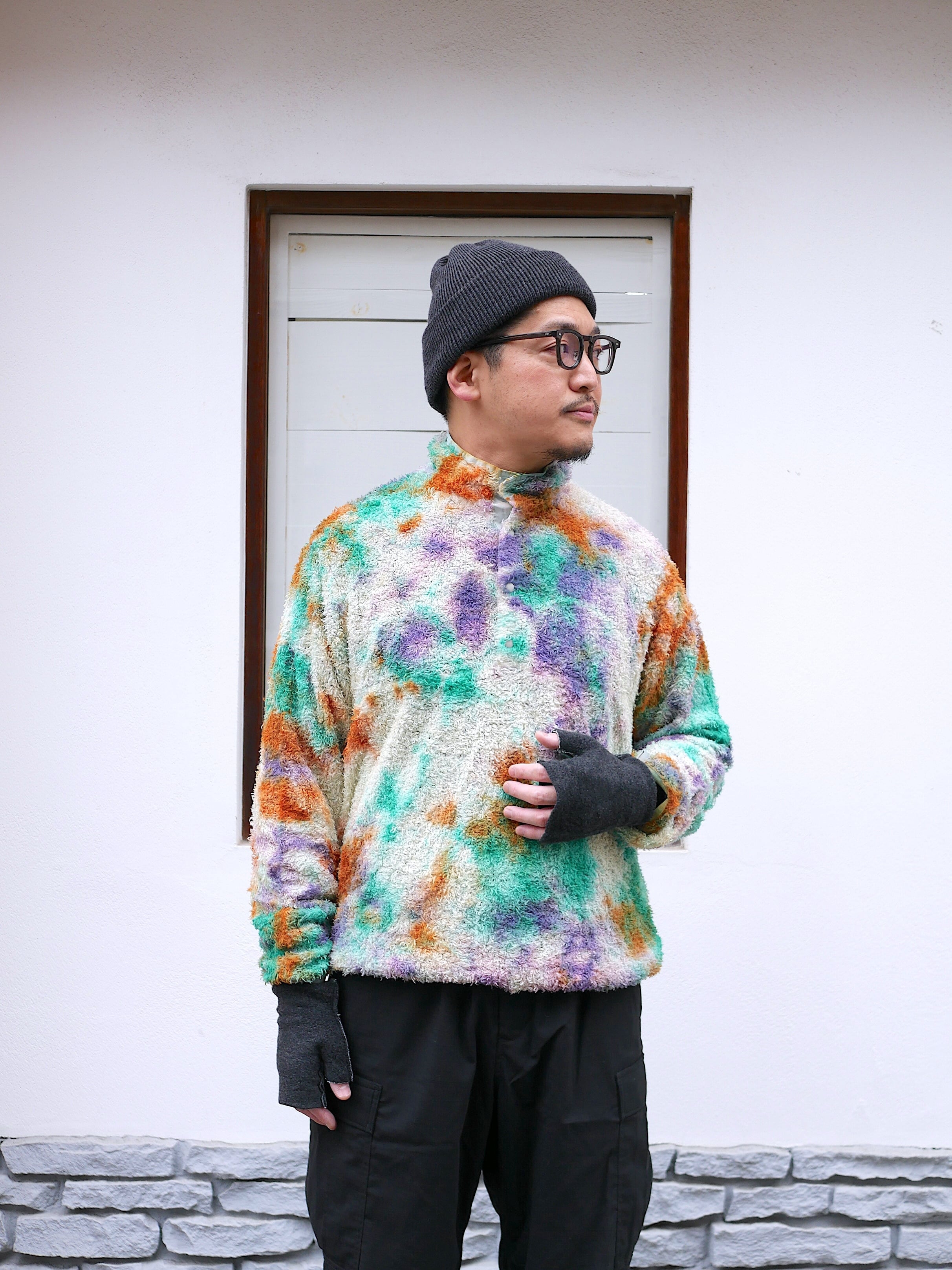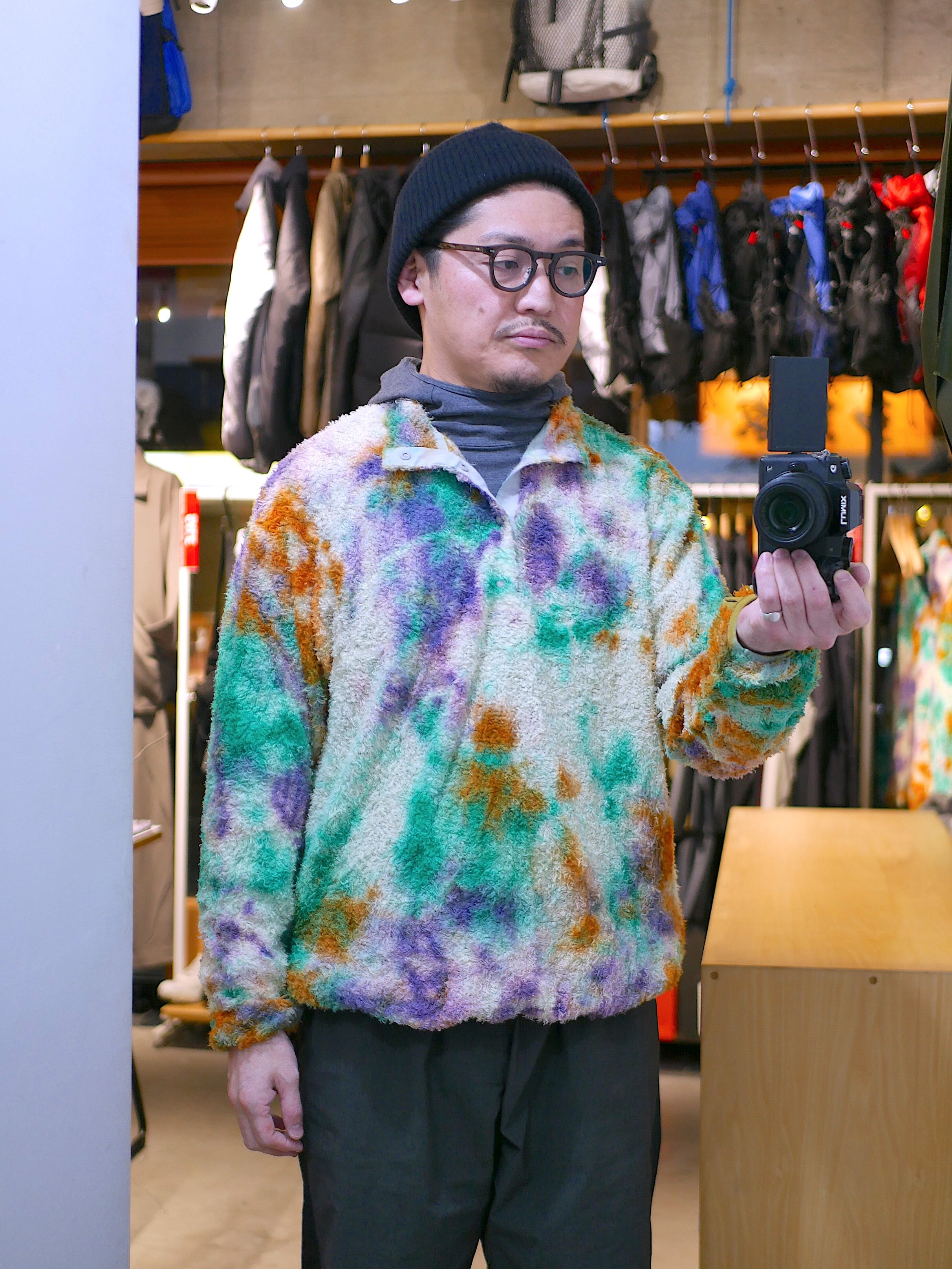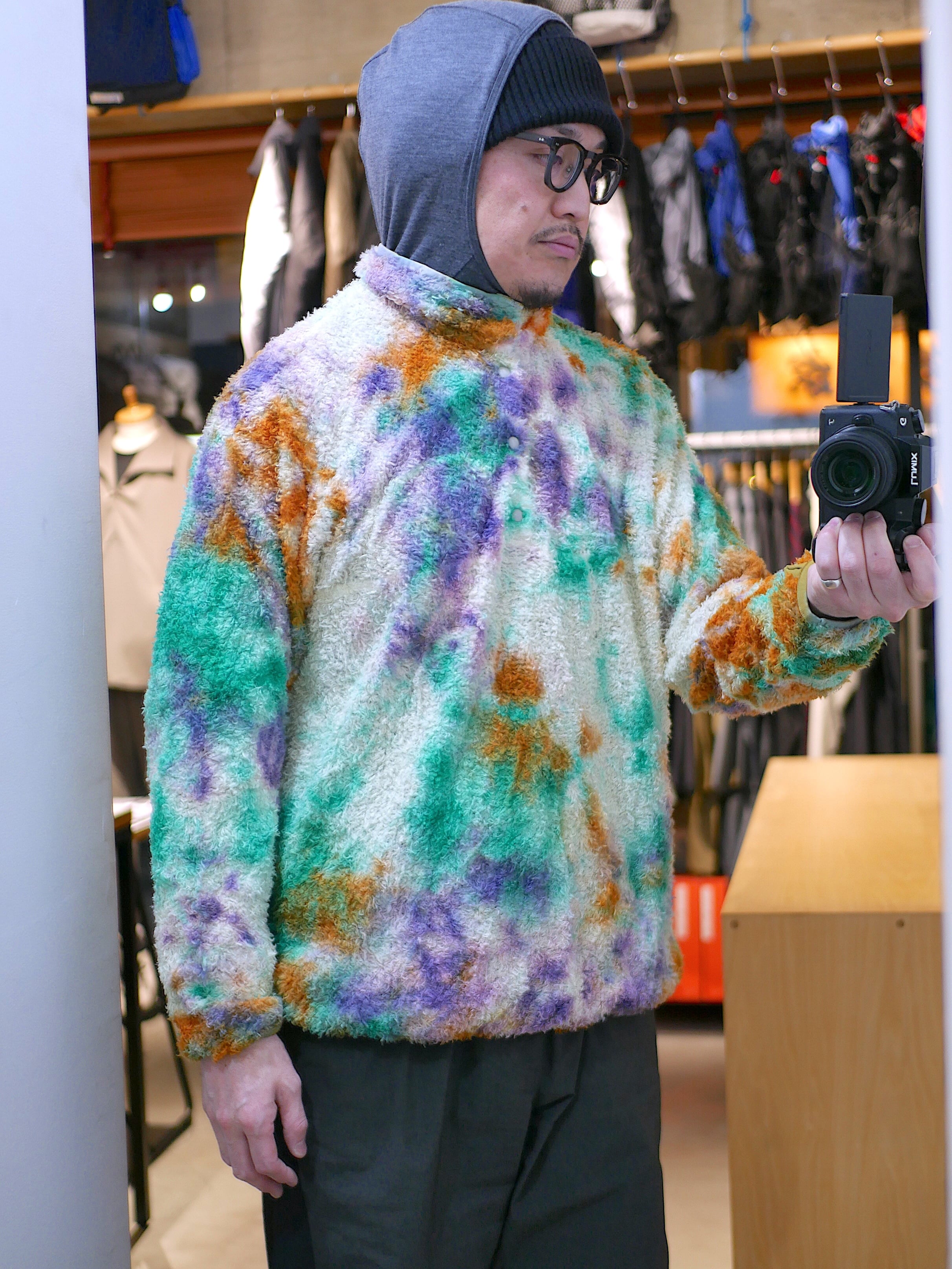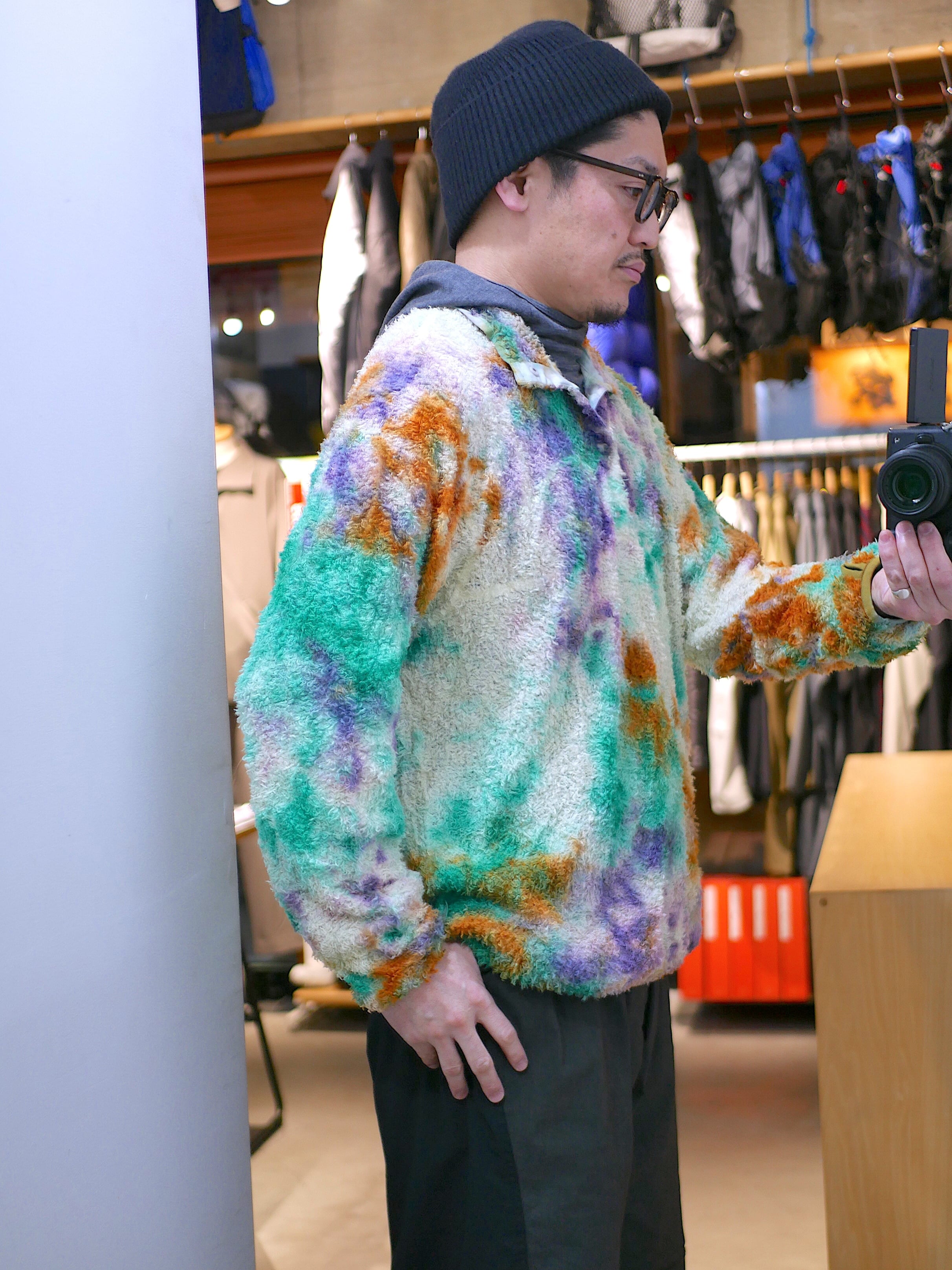 リサイクルポリエステルを使った120g/m2 厚のPOLARTEC ALPHAをセレクトし、縫製後に4回の絞染でタイダイ風に仕上げました。