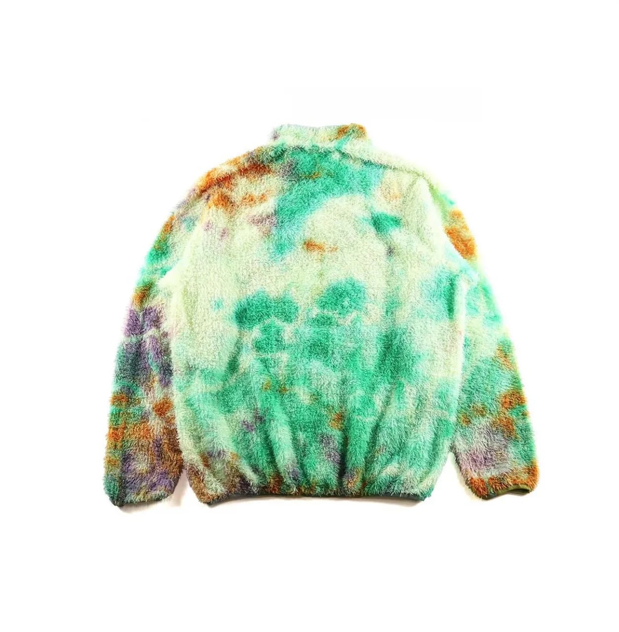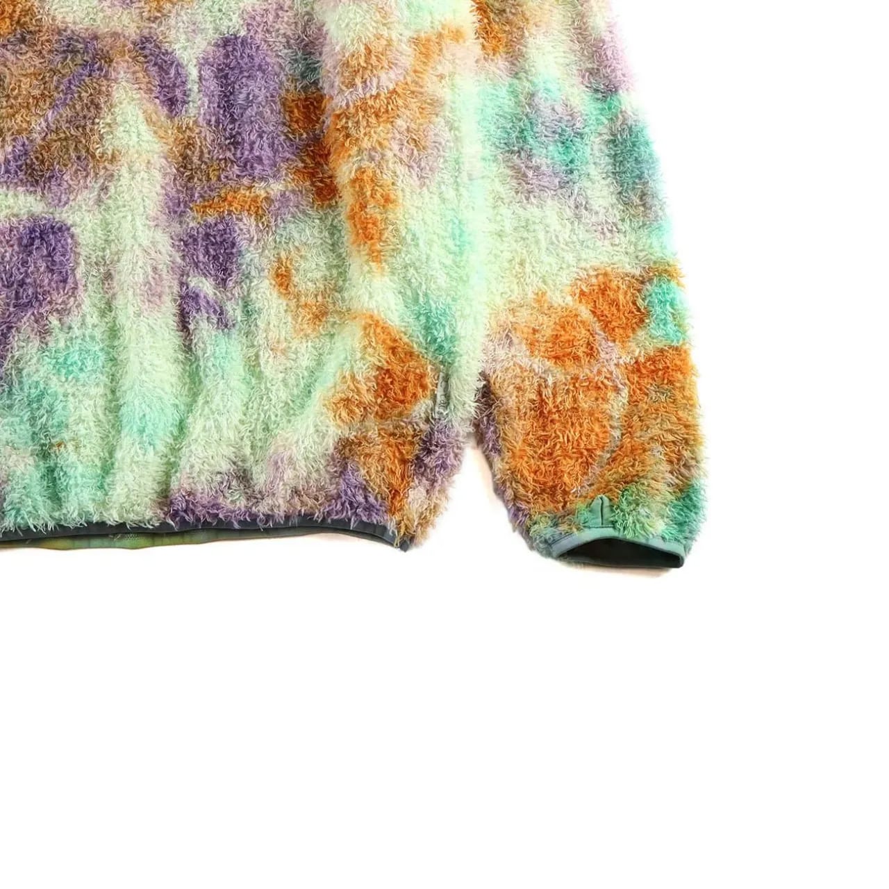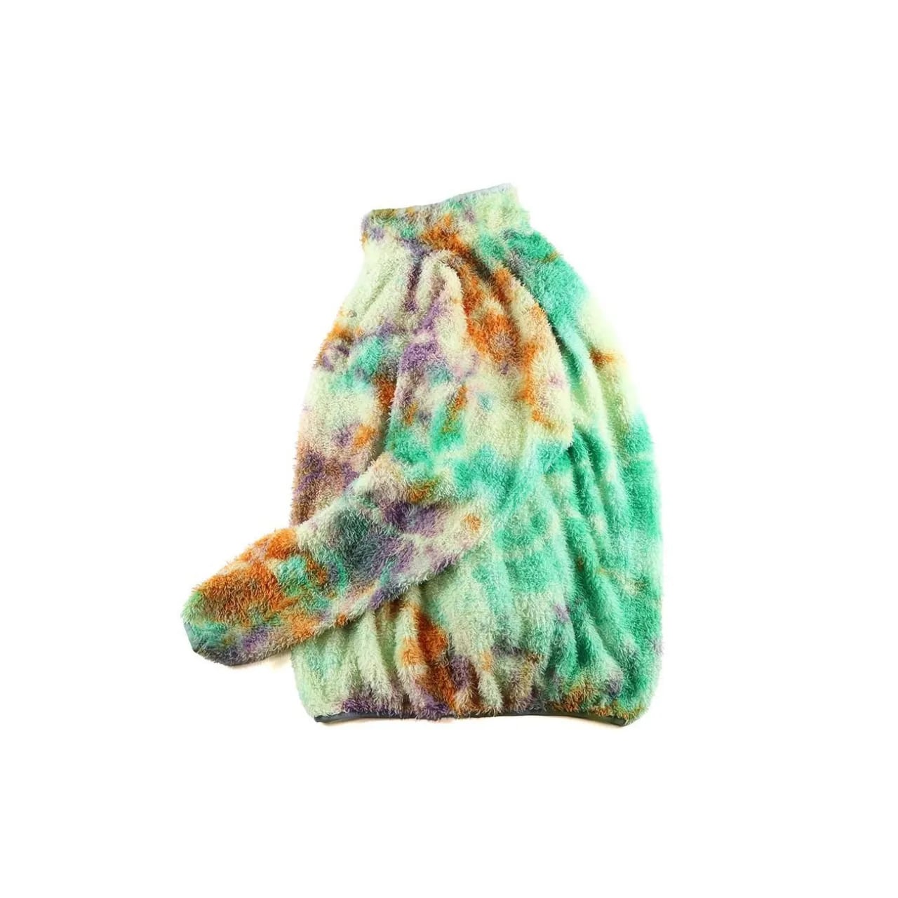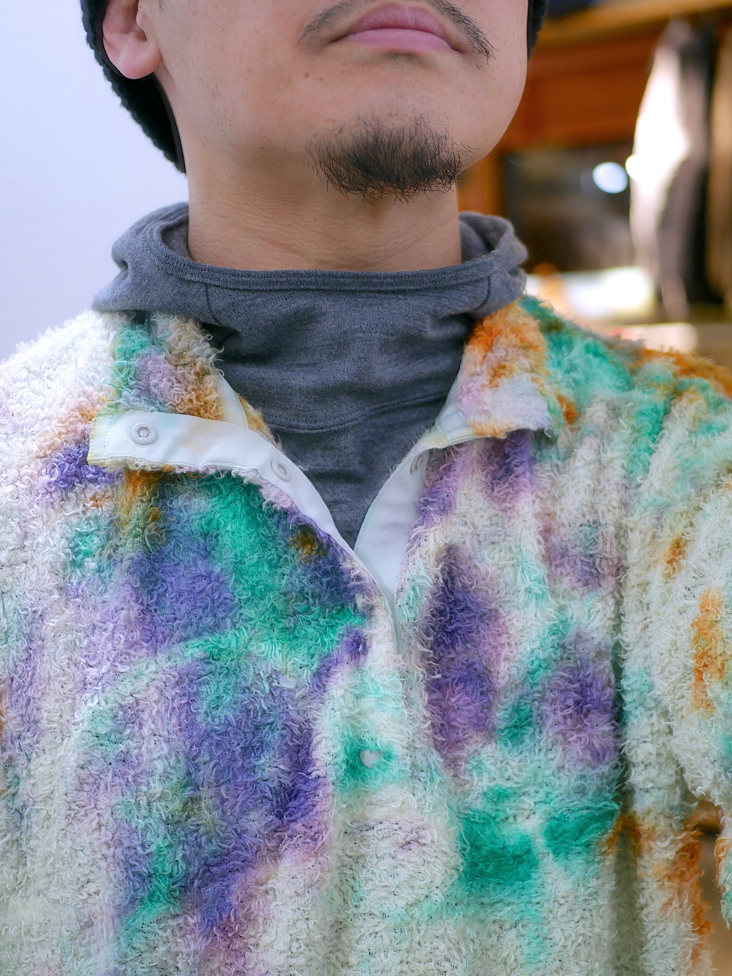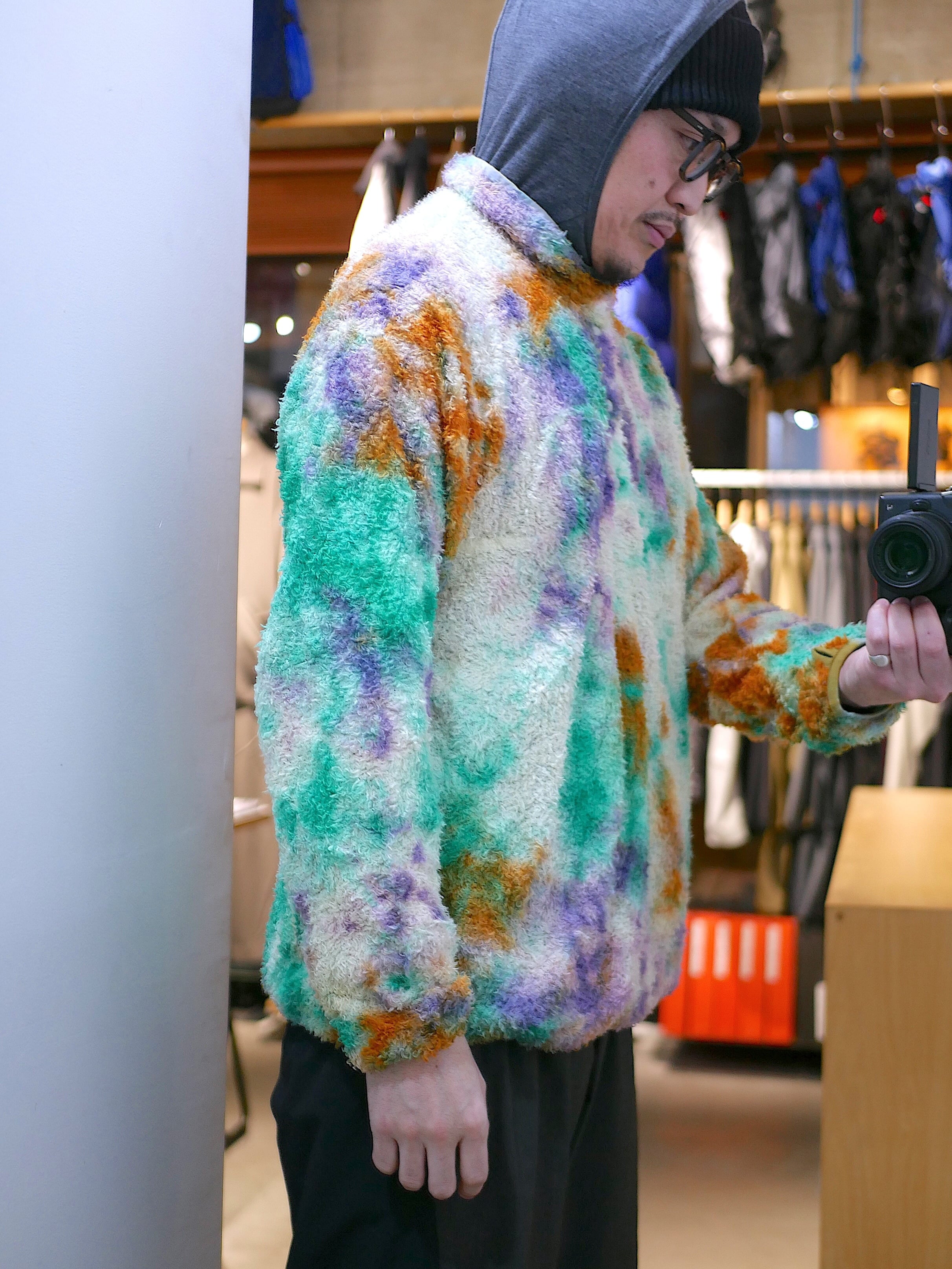 リサイクルポリエステルを使った120g/m2 厚のPOLARTEC ALPHAをセレクトし、縫製後に4回の絞染でタイダイ風に仕上げました。