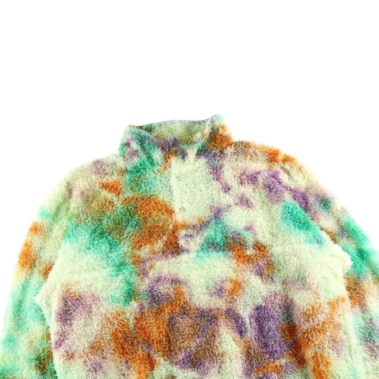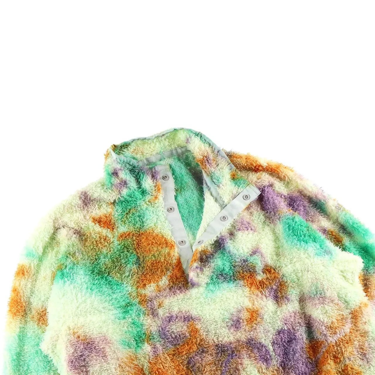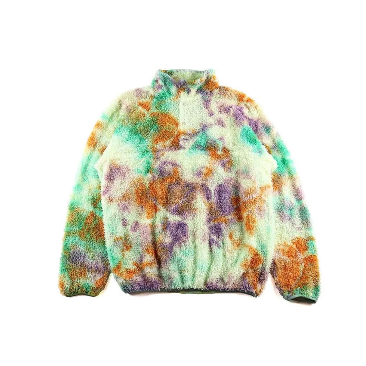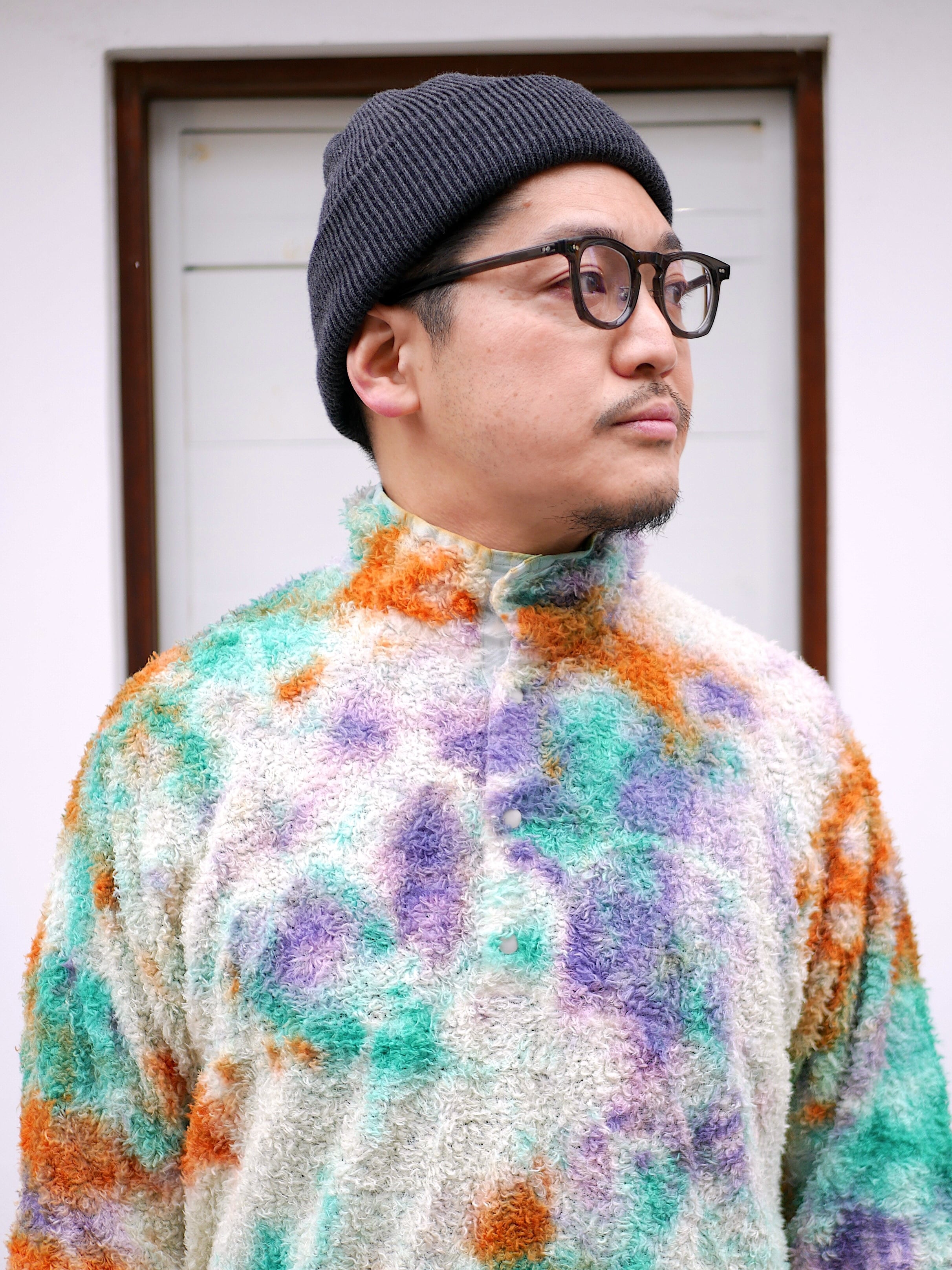 リサイクルポリエステルを使った120g/m2 厚のPOLARTEC ALPHAをセレクトし、縫製後に4回の絞染でタイダイ風に仕上げました。