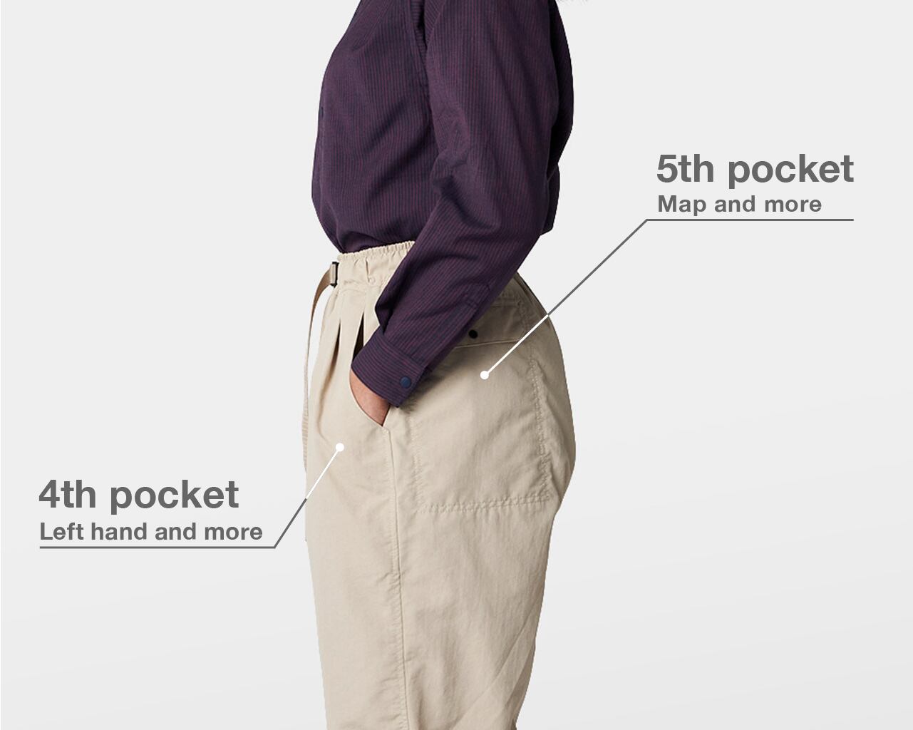 山と道オリジナルデザインの5つのポケットが、ハイキング中に必要な荷物を脚の動きを邪魔することなく効率的に収納。