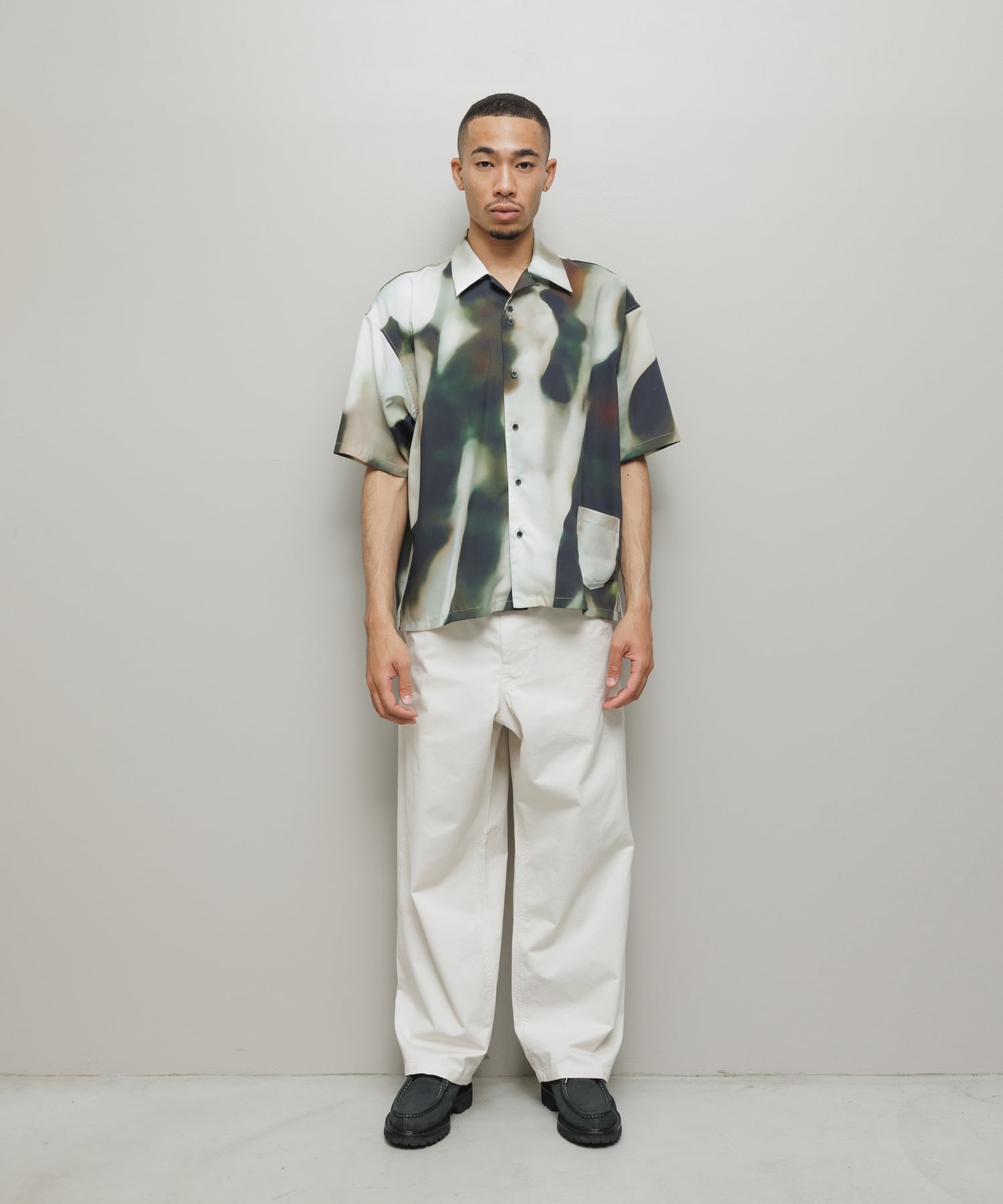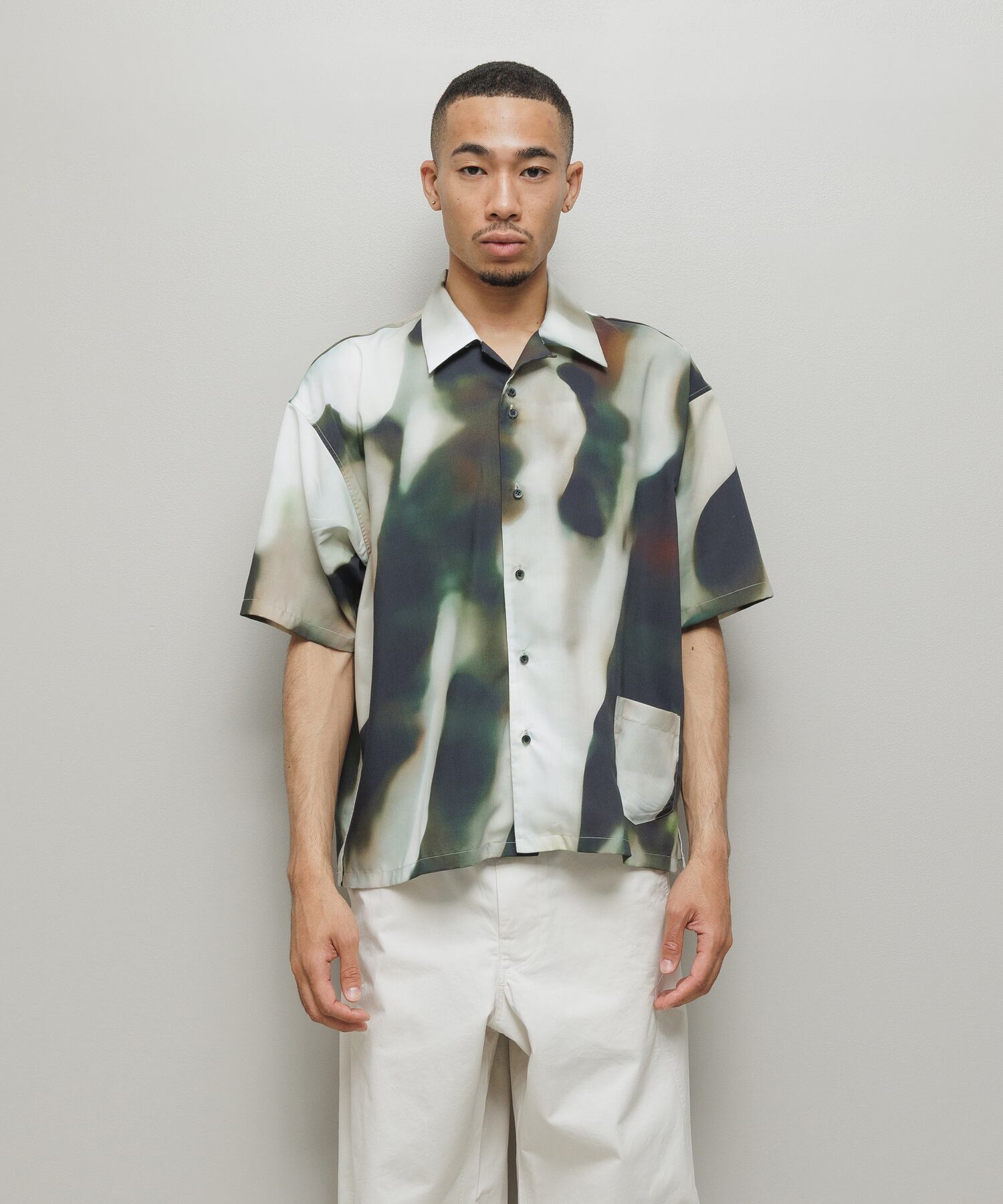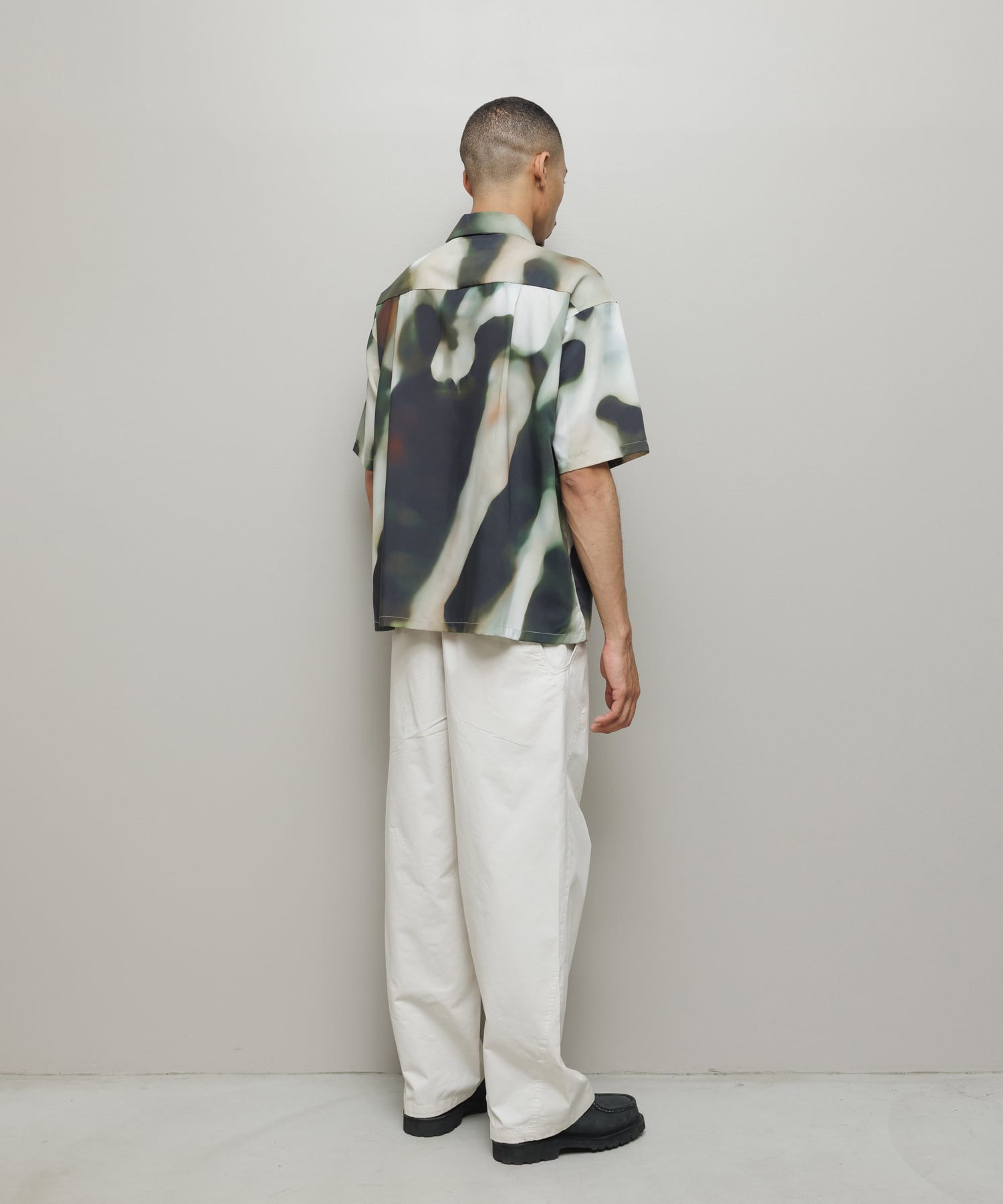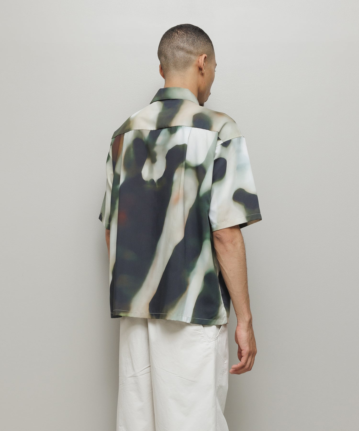 balオリジナルグラフィック「BLUR」柄のオープンカラー・ショートスリーブシャツ。