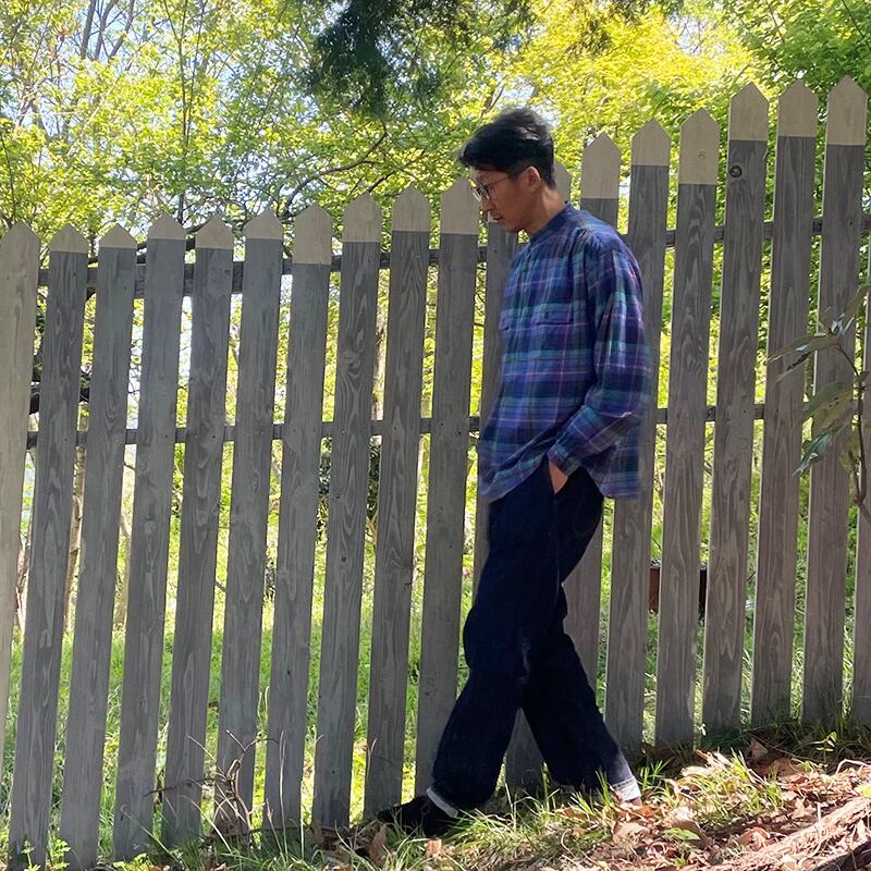 オリジナルファブリックである "Winter madras" を使った "Stand collar"。