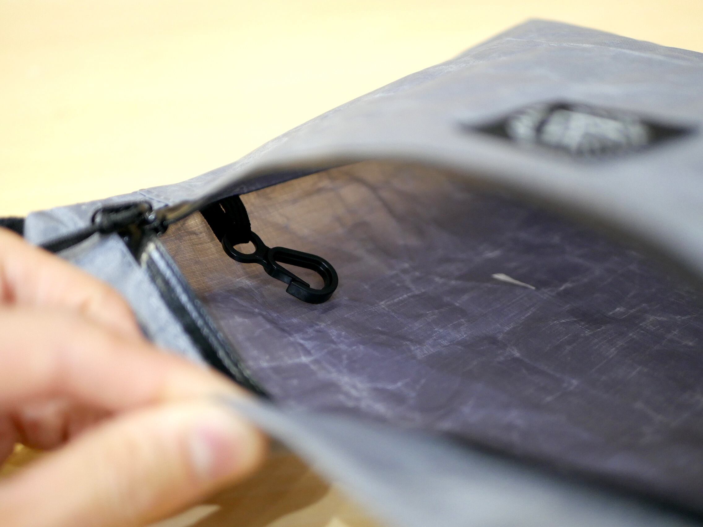 ファスナー部分はラバー製の引き手をプラス。開口時に少し重めの感触があるアクアガードですが取ってが滑りにくくファスナーが引きやすくなりました。