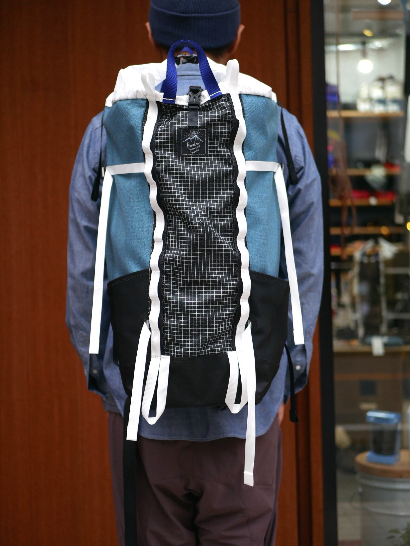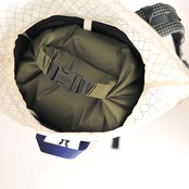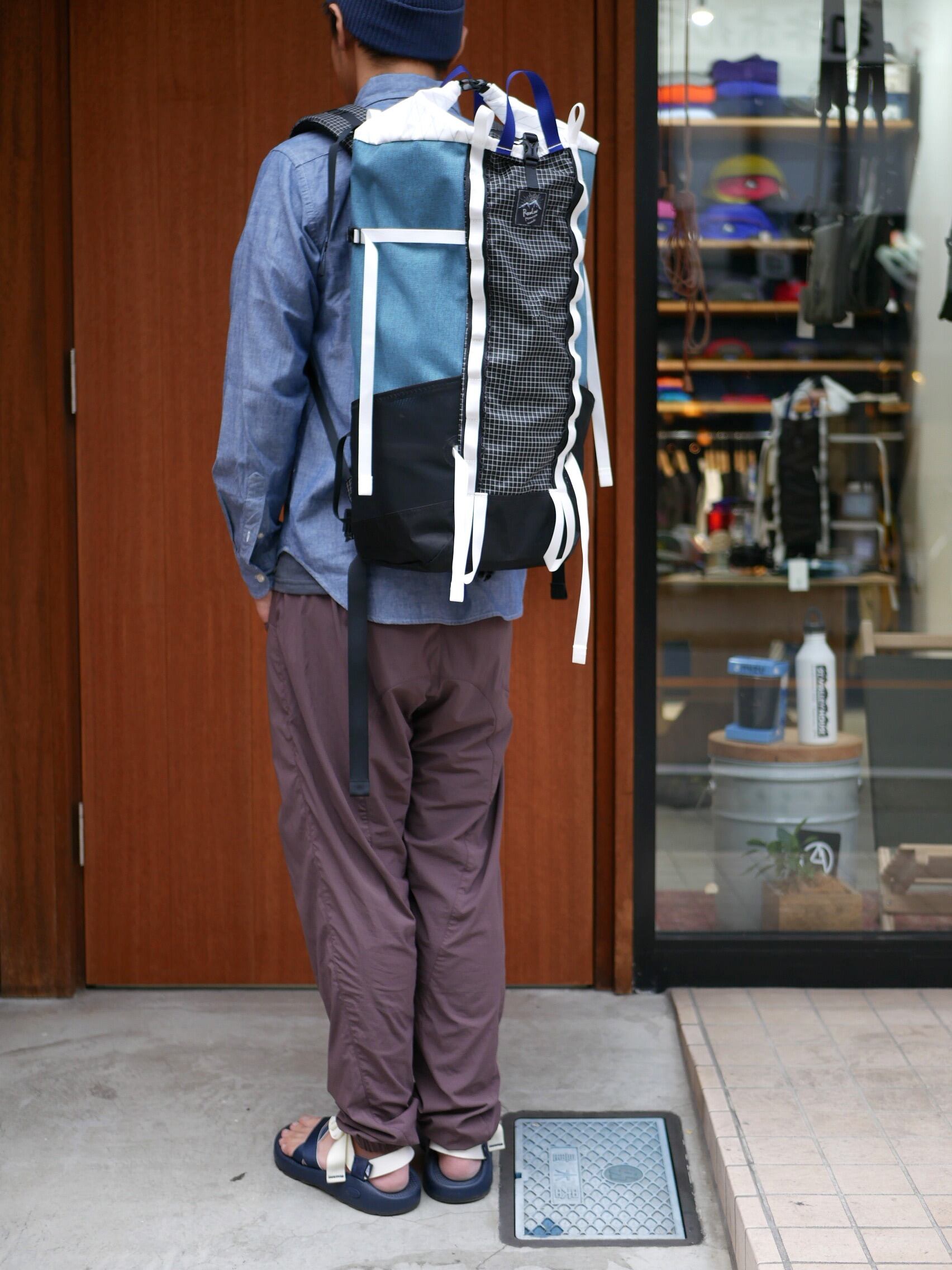 メインの素材はタフな1000デニールのナイロン、80年代の古き良きヘビーデューティープロダクトへのオマージュが杢の入ったナイロンの表情と独特なカラーで表現されています。日本の山域に多い花崗岩などの岩場においてのスレなどに強く、また冬期にスキー等をサイド部分にアタッチした場合にも対応できる強靭な素材を選んでいます。冬期にピッケルやアイゼンと干渉する、フロントパネルや摩擦頻度 の高いハーネス部分には割けに強いダイニーマ X グリッドストップを使用。スレが多く水に濡れる頻度の高いボトムとロールトップ部分には軽量で強く、また防水性の高いX-PACを使用しています。生産効率のみを追求するのではなく、適材適所の考え方で素材選択を行った結果、このマルチファブリックの結論に達しました。
