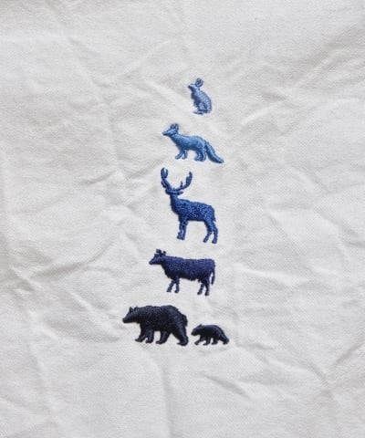 彼らの横姿を平面的かつ表情を感じさせないようにグラフィック化して出来上がったのが、これらの刺繍ですが、自分のファッションルーツの割合を大きく占めるのがIVYということもあり、彼ら長野の動物たちをIVY仕立てにして自分が作る洋服に取り込んだと言えばよいのかな。