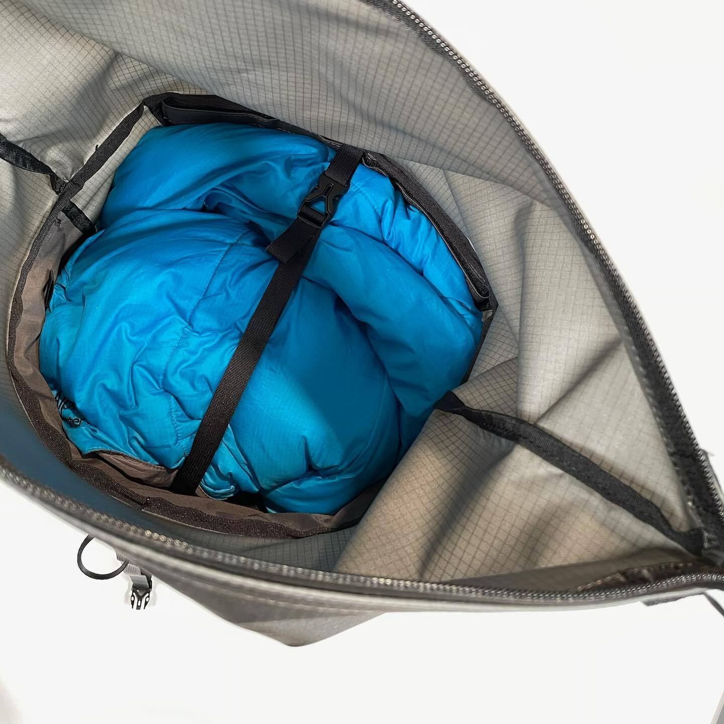 開閉部ファスナー+ロールトップで容量の大幅な可変が可能。
